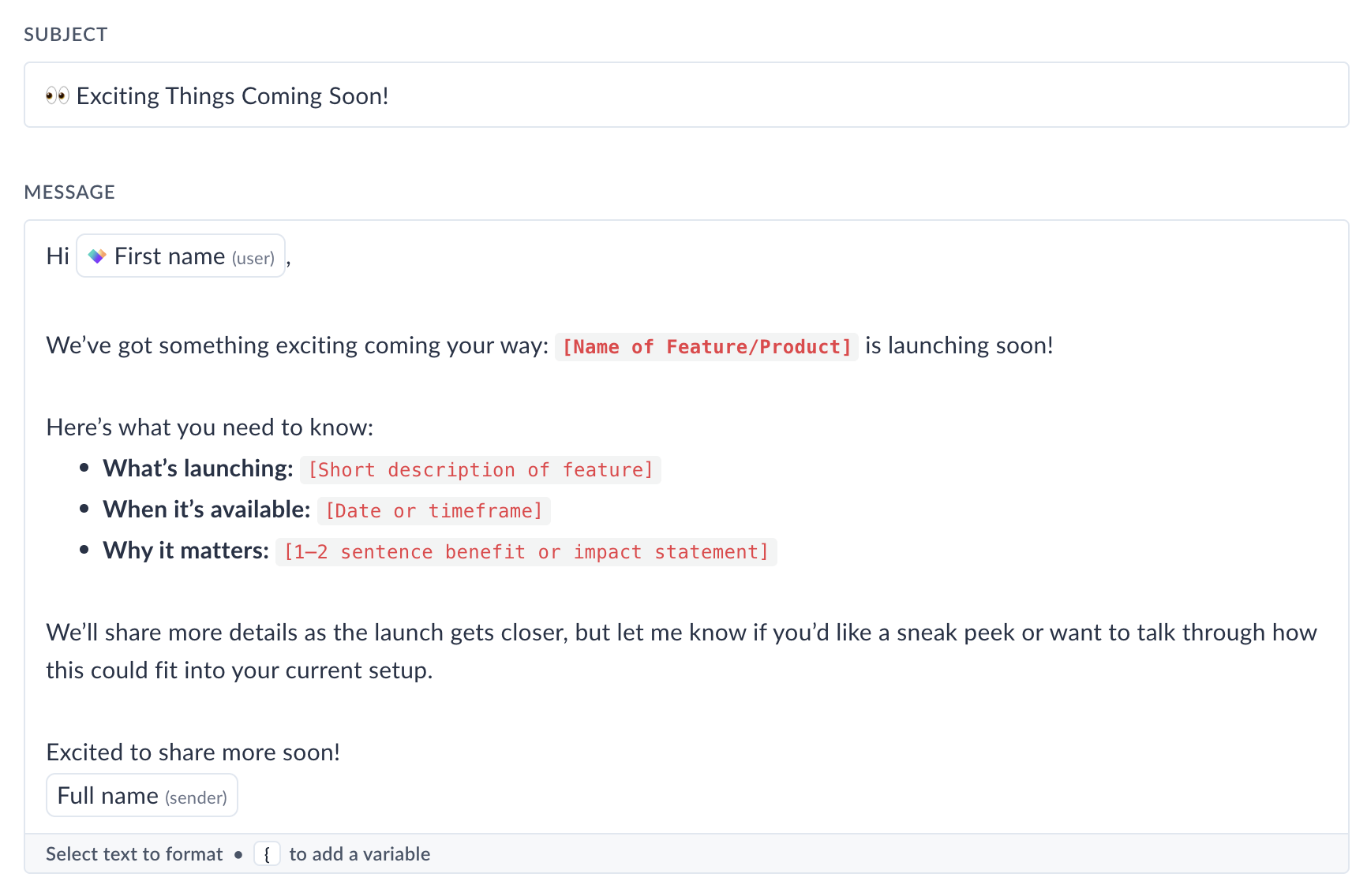 Keeping customers informed of new features is essential to driving adoption and perceived value. This email template gives CS and Product Marketing teams a scalable way to share product updates on a regular cadence.