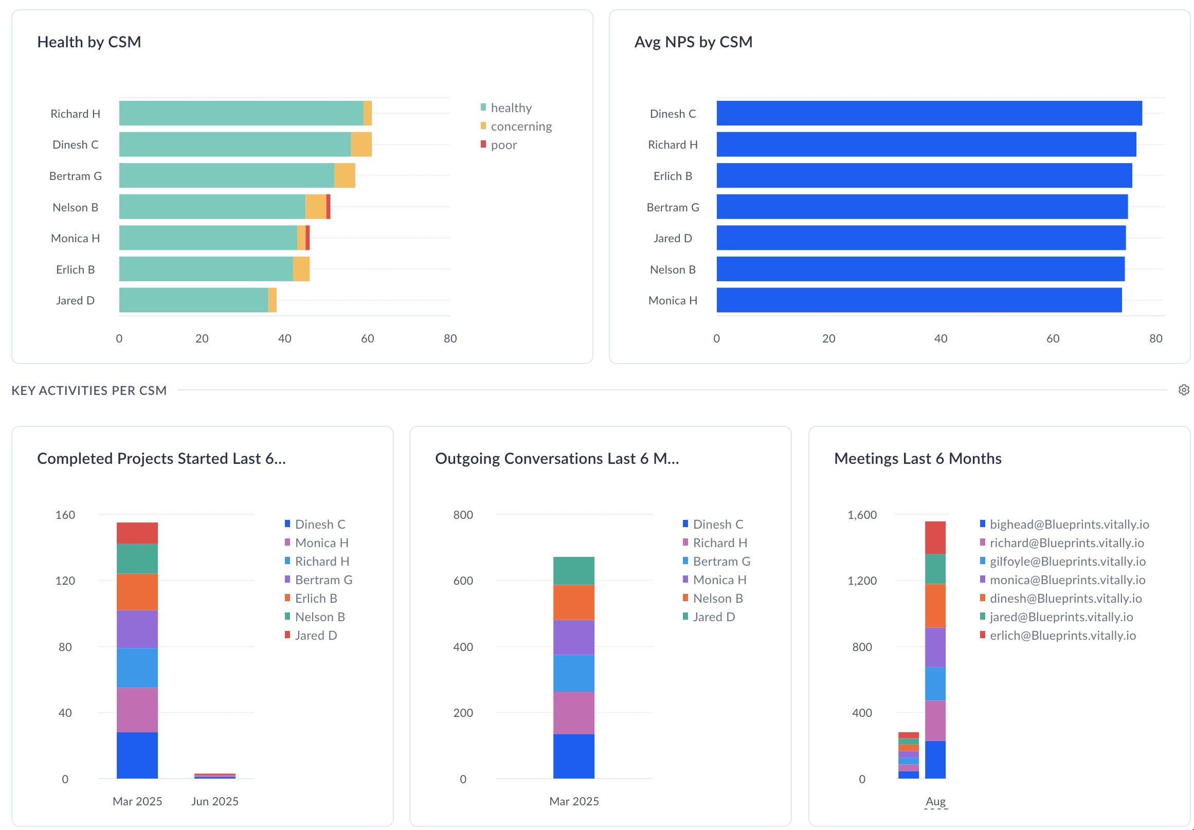 Revenue performance is the heartbeat of CS. This Dashboard equips team leads with real-time visibility into expansion, churn, NRR, GRR, and key activity metrics at both team and individual CSM levels.