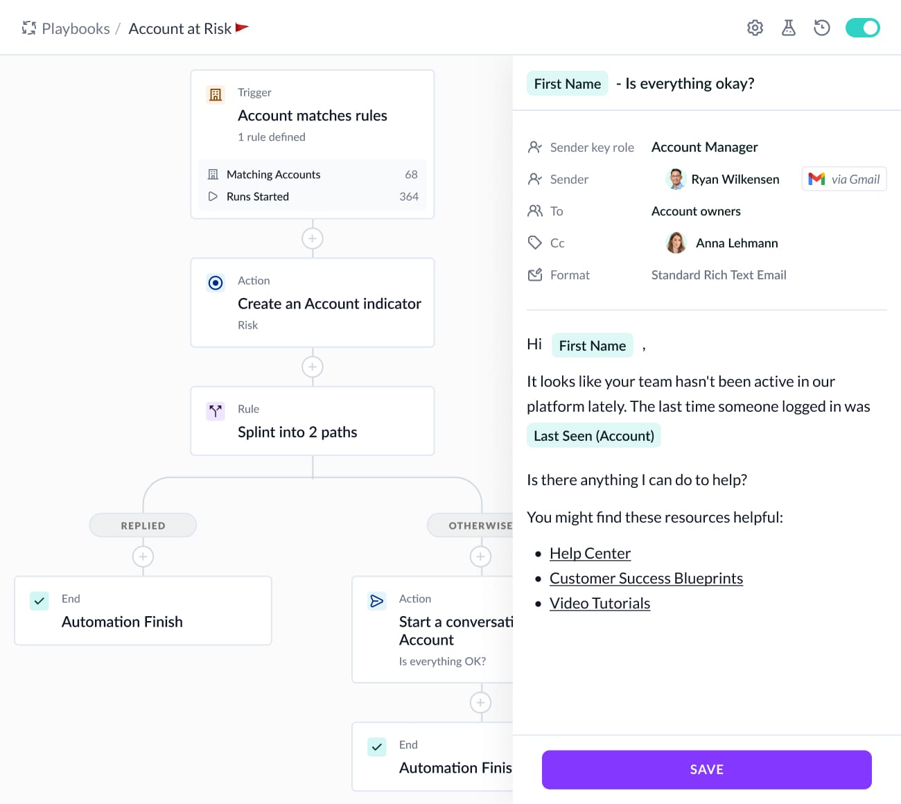 Manage expansion, renewals, and churn risk with automation Playbooks and alerts designed for fast-moving AMs.